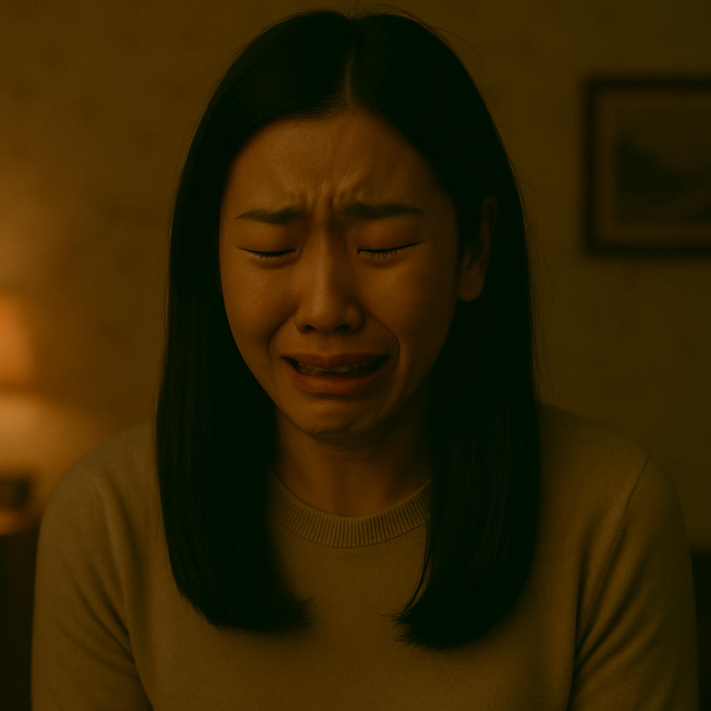 깊은 슬픔에 잠긴 여성 배우가 흐느끼며 오열하고 있는 장면. 눈물로 가득 찬 얼굴, 일그러진 표정, 그리고 조용한 실내 배경이 감정의 진폭을 강조하며, 극적인 연기 순간을 섬세하게 담아낸 오리지널 한국 영화의 스틸컷